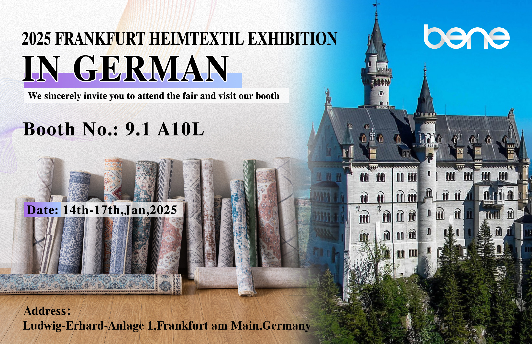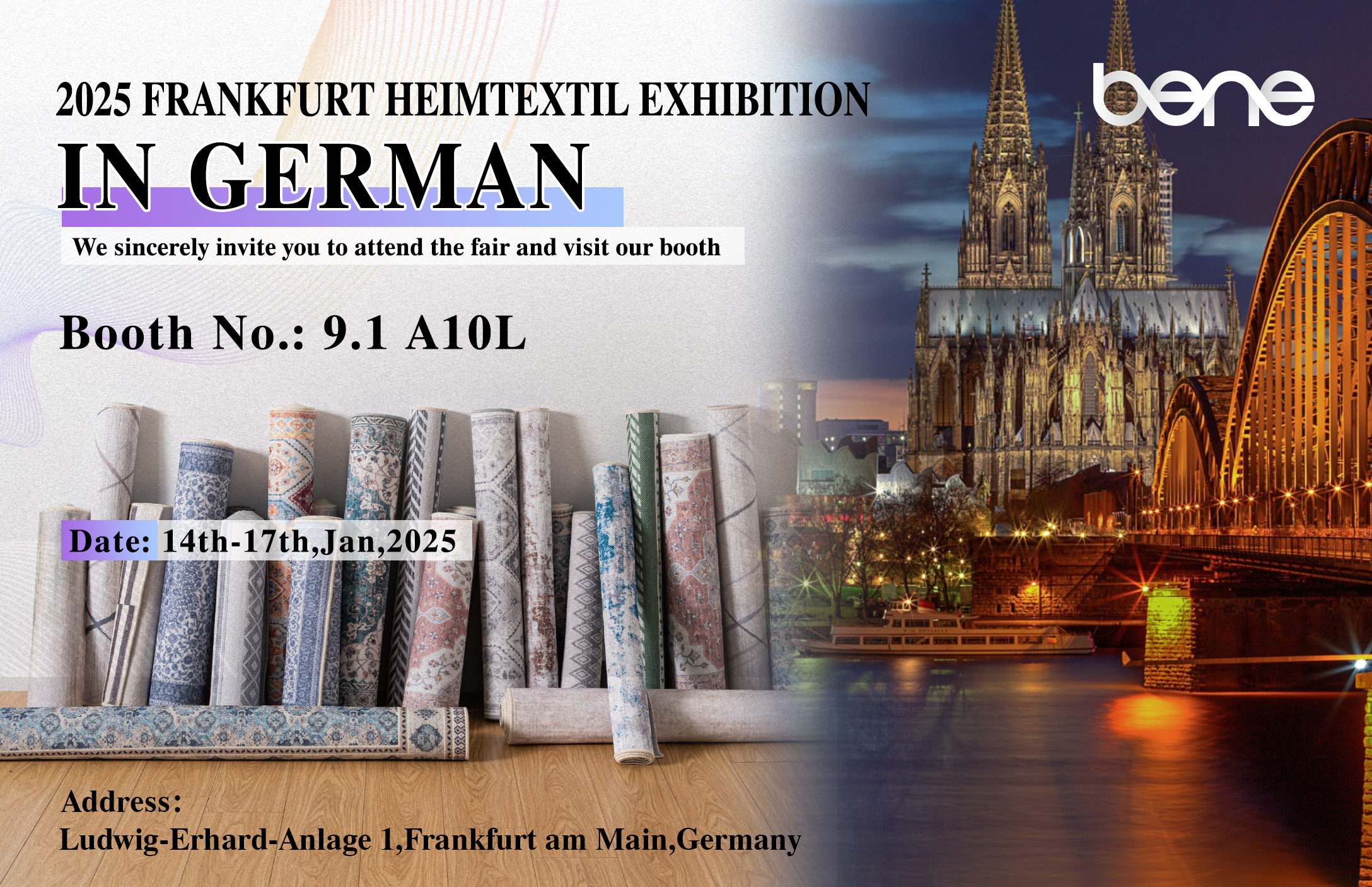 Di Benyi Textile, kami mematuhi filosofi "inovasi, keberlanjutan, kualitas," berusaha untuk memberikan pelanggan global karpet dan solusi tekstil rumah terbaik. Pameran Frankfurt Heimtextil 2025 adalah kesempatan sempurna bagi Anda untuk menemukan produk dan teknologi terbaru kami, dan kami sangat menantikan kunjungan Anda.